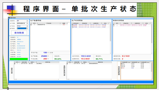 可以記錄每個(gè)生產(chǎn)批次的生產(chǎn)數(shù)量、不良數(shù)量、停機(jī)時(shí)間、運(yùn)行時(shí)間、維修時(shí)間、維修 次數(shù),可以記錄設(shè)備的保養(yǎng)和易損件更換。