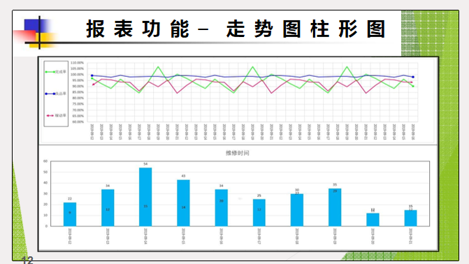有豐富的統(tǒng)計(jì)功能,對(duì)于產(chǎn)量、不良品按時(shí)間進(jìn)行統(tǒng)計(jì),統(tǒng)計(jì)維修時(shí)間、維修次數(shù)、停 機(jī)時(shí)間、停機(jī)次數(shù)、運(yùn)行時(shí)間,這些龐大的基礎(chǔ)數(shù)據(jù)進(jìn)行歸類,可以為決策者制定生產(chǎn) 和設(shè)備改善計(jì)劃提供強(qiáng)大的數(shù)據(jù)支持。